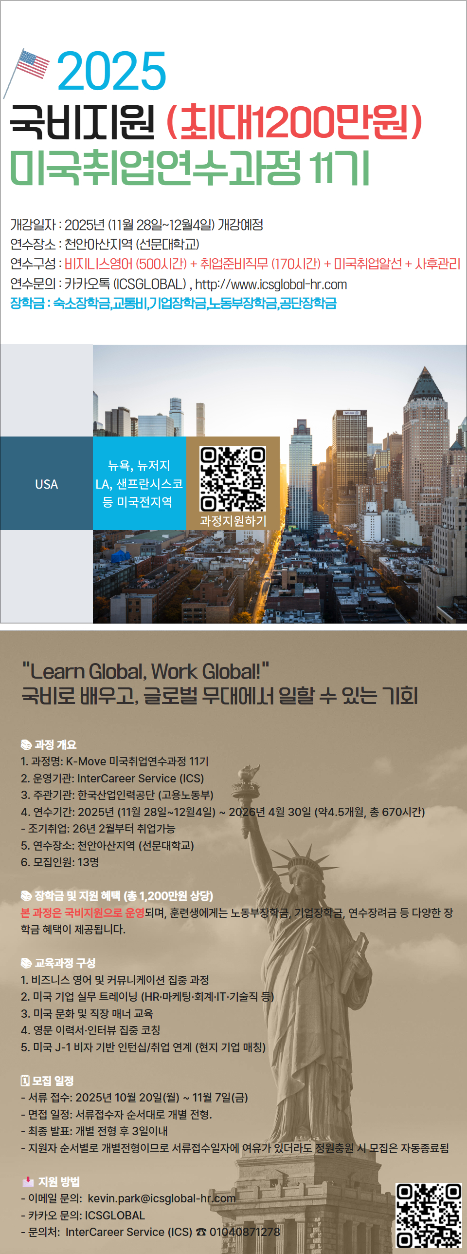 2025년 국비지원 미국취업연수과정 11기 연수가 11월 말 시작 예정으로 KMOVE 국비지원 미국취업연수과정 학생을 모집 및 선발 중에 있습니다.